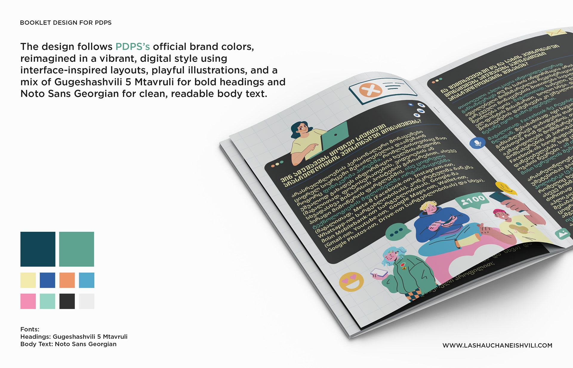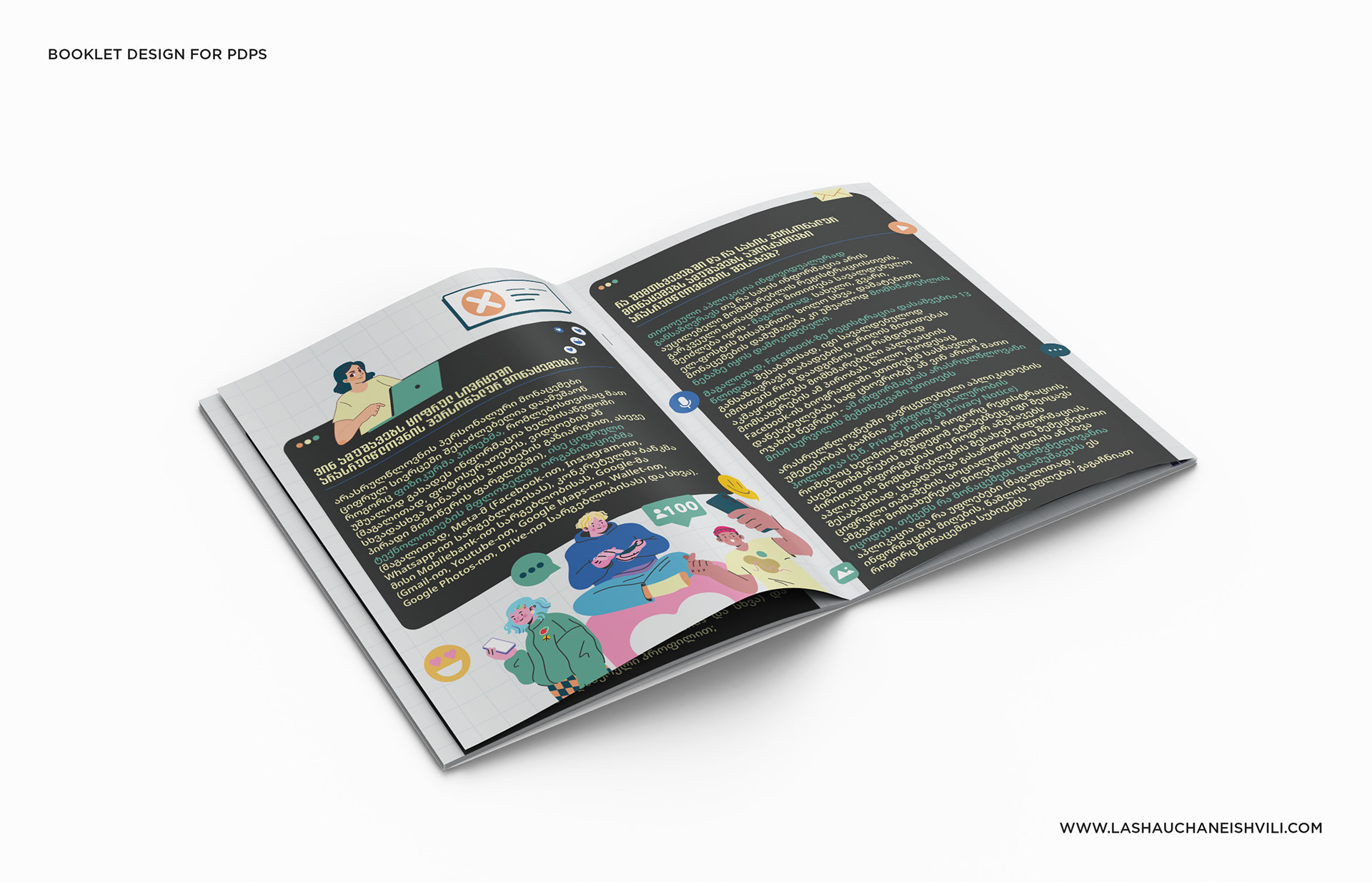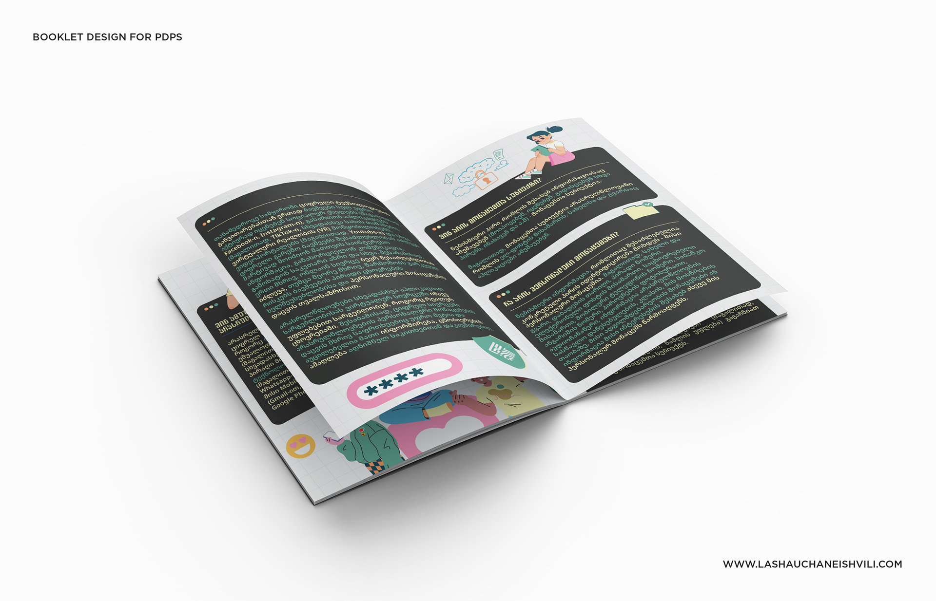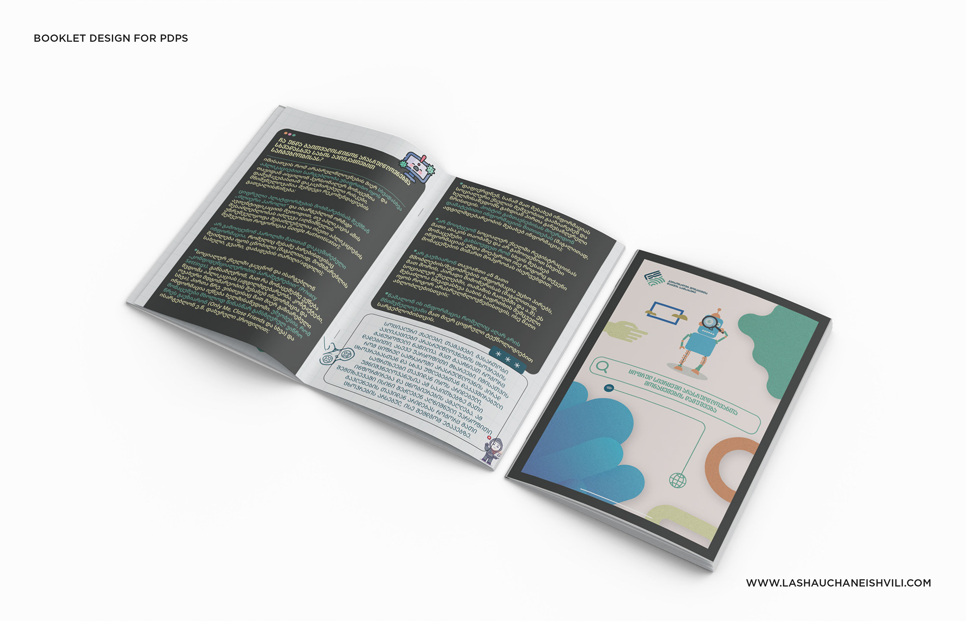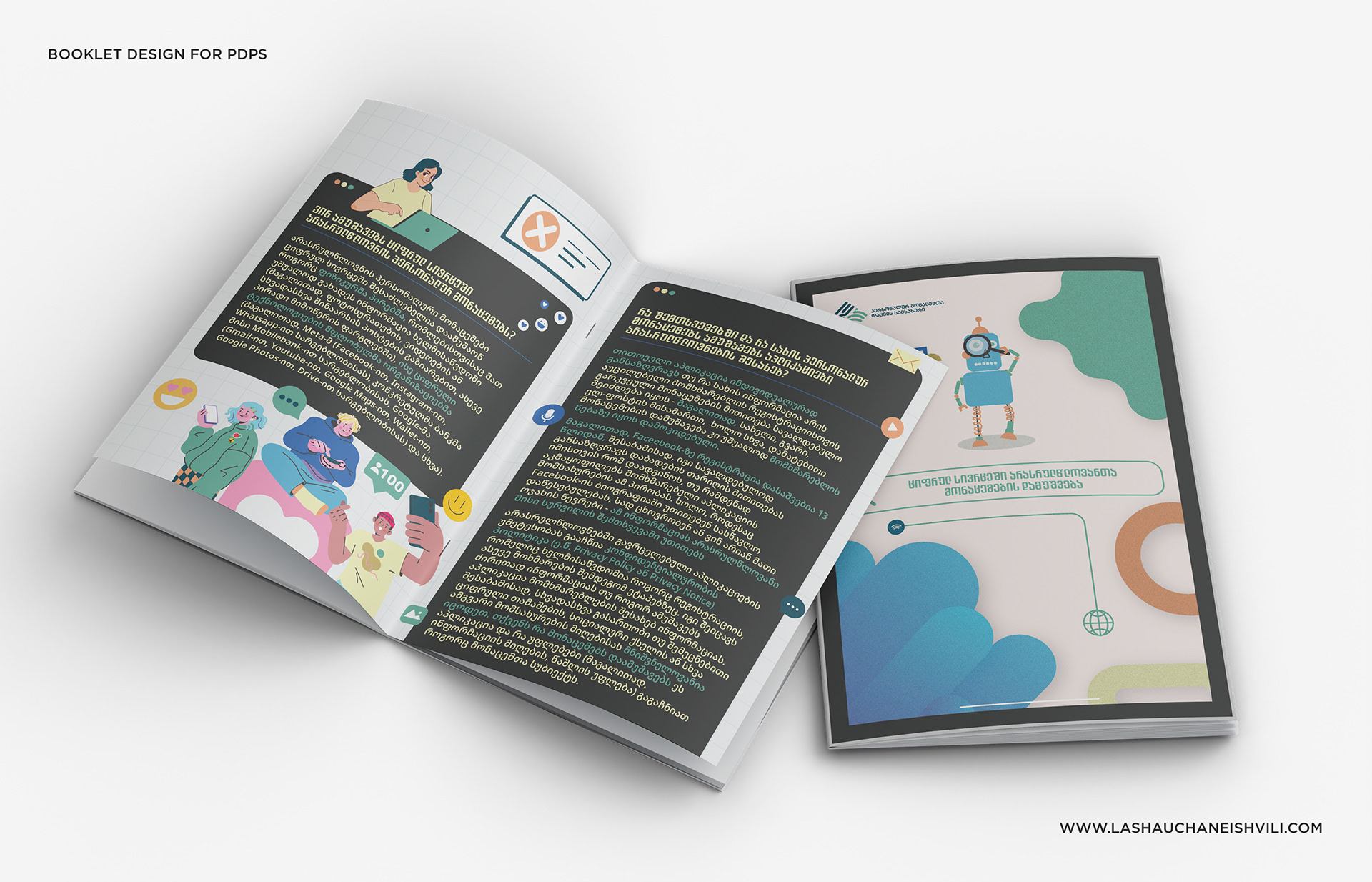 This booklet was designed for the Personal Data Protection Service of Georgia (PDPS) to raise awareness about privacy and safe digital habits among minors.